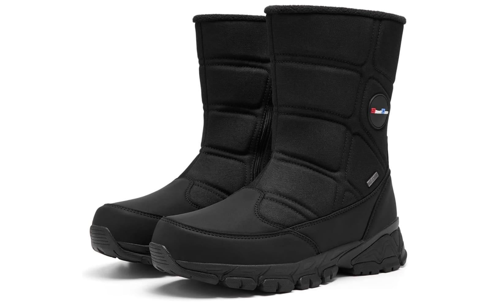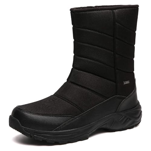 The boots feature a water-resistant oxford cloth or faux-leather exterior designed to repel moisture and snow, though they are best suited for casual winter use rather than prolonged submersion in deep slush or water.